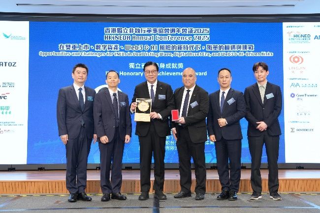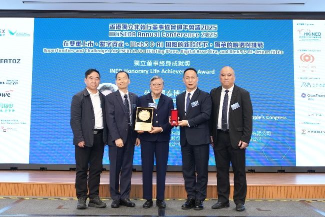 香港, 2025年12月10日 - (亞太商訊) - 香港獨立非執行董事協會(「HKiNEDA」)週年會議於上週六順利舉行。今年會議以「在雙重上市、數字資產、Web3 & AI風險的新時代下,獨董的機遇與挑戰」為主題,邀得本港主要金融監管機構代表,以及各地行業專家和公司代表深入討論和交流,成功吸引近300位管理人員出席。協會更頒授「獨立董事終身成就獎」予范徐麗泰博士及馬時亨教授,以表彰二人對業界及企業管治的卓越貢獻。