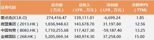 就估值來看,電商、軟體這些未來價值較高的行業,我們通常用PS估值法。通過wind的資料對比(如下圖),我們能很明顯地看到愛點擊的PS市銷率不及微盟、有贊、金蝶這些同行們的零頭,估值對比下來相當低。
