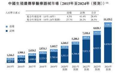據弗若斯特沙利文披露,中國生殖遺傳學醫療器械市場在過去5年以27.17%的複合增速增長至34億元,預計將以26.2%的增長速度進一步增長到112億元,其中檢測試劑將達到89億元。