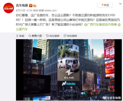 香港, 2021年8月27日 - (亞太商訊)  - 8月11日,知名汽車博主名車縱橫在微博發佈了一張美國時代廣場的廣告圖。廣告中主打的汽車與五菱新能源物流車EV50高度相似,引發網友熱議。網友甚至猜測美國廠商是否山寨了中國的五菱。